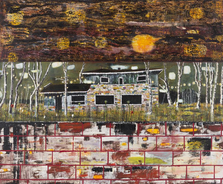 Oil, emulsion, shellac, ashes, and lead on canvas, 250×440 cm