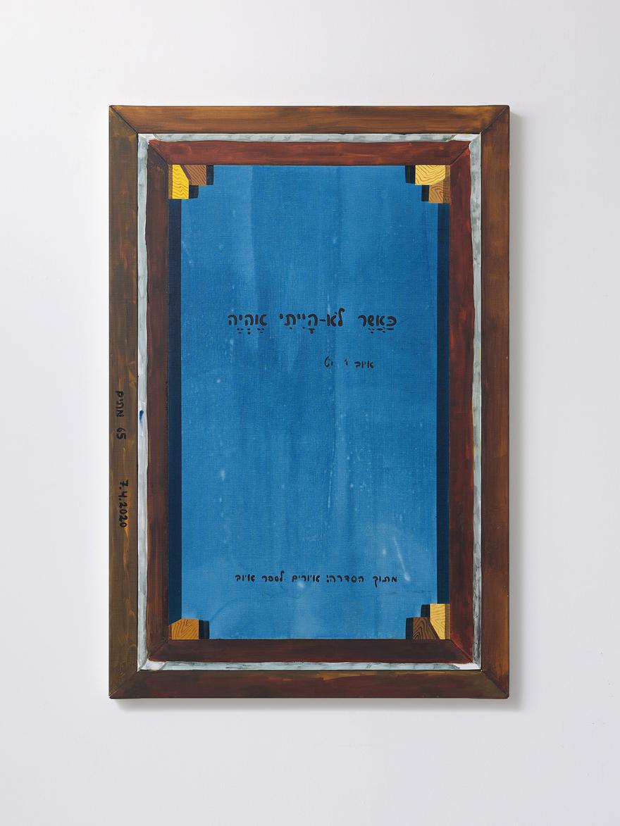 Since 1994, the key motif in Ginton's oeuvre has been the "back" of the painting, initially in photographs of the reverse side of paintings from the collection of Tel Aviv Museum of Art, and later, in the 2000s, in verso paintings alluding to the trompe l'oeil tradition in Western painting. These paintings depict the (alleged) backs of fictitious paintings, bearing the paintings' titles alongside texts—excerpts from theoretical essays and books about art, biblical verses, Midrashim, as well as invented texts. In presenting the text appearing on what seems to be the back side of a painting, Ginton brings the literal-conceptual aspect underlying his work to the fore. The painting's reversal is interpreted in these paintings in terms of revealment and concealment, questioning the work's elusive existence and its ability to reveal itself to the viewer, while concurrently hinting at theological aspects associated with seeing the face of God and with death.