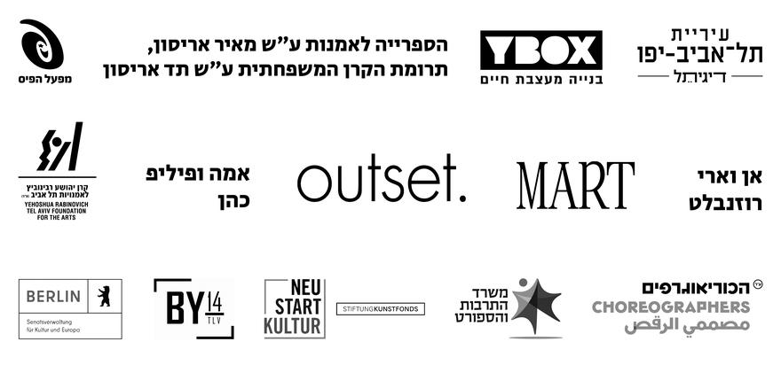 Tel Aviv Municipality – Digitel; YBOX; MART Foundation; Ann and Ari Resenblatt; The Art Library in Memory of Meir Arison donated by the Ted Arison Family Foundation; Israel Lottery Council for Culture and Arts; Outset Contemporary Art Fund; Emma and Philippe Cohen ; Yehoshua Rabinovich Foundation for the Arts, Tel Aviv; Israel Ministry of Culture and Sports; and The Choreographers’ Association
