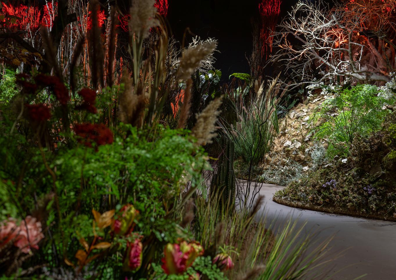In the installation The Garden, one eighth of an acre—the gallery’s total area—has been transformed into a plot full of knolls, trees, and bushes (some gathered in nature, others made of plastic and silk). Visitors are invited to wander among the paths illuminated by nocturnal light, where the sounds of nature can be heard.