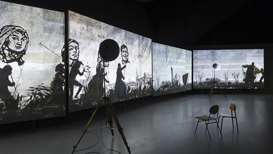 A spectacular procession of figures, silhouettes, drawings and sculptures make up this video installation by prominent South African artist William Kentridge (born in Johannesburg in 1955). The installation is an 8-screen video, depicting an endless procession in a loop, while brass band music plays in the background.