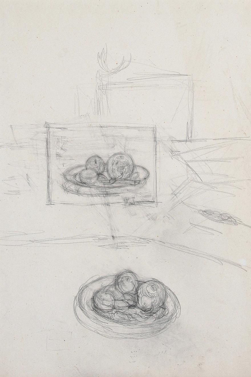 אלברטו ג'אקומטי, תפוחים משתקפים במראה (בצדו השני של הרישום: סילביו מתחת לנברשת), 1953