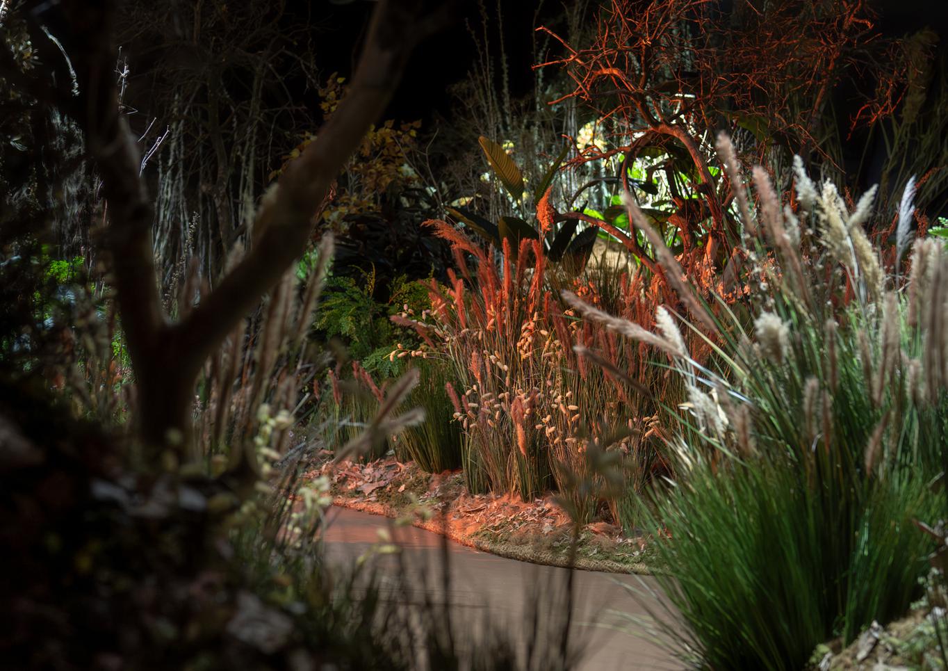 בתערוכה הגן הופכת הגלריה – חצי דונם שטחה – למרחב של גבעות, עצים ושיחים (חלקם לוקטו בטבע וחלקם מפלסטיק ומֶֶשִִׁי). זוהי הזמנה לשוטט בין שבילי הגן המואר באור לילי, ולשמוע בו את רחשי הטבע.