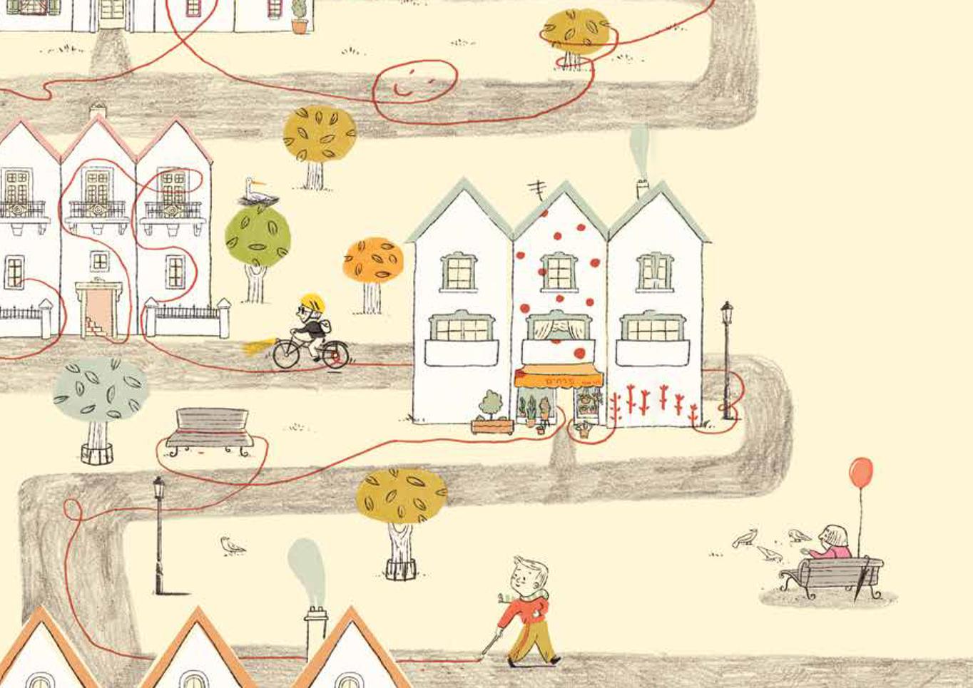 קרדיט דימוי: צִיּוּר עִיר, מתוך הספר בקצה הרחוב איריס ארגמן, איור: שחר קובר (הוצאת מטר, 2014)